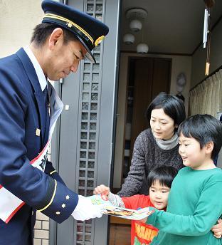 12月20日(土曜日)に,山科区出身で広島東洋カープで活躍されている「倉 義和」選手を一日消防署長に迎え,一般家庭を訪問しての出火防止の呼び掛けや,区内の事業所における合同消防訓練及び街頭広報を実施しました。