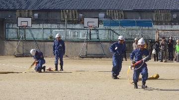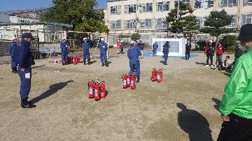 今年も京都市消防出初式に引き続き,同日午後から大藪小学校において久世分団出初式を行いました。多くの学区民の前で,品位ある規律正しい点検礼式や小型動力ポンプ操法による力強い実放水などを行い,安心・安全のまち久世学区を目指す,団員の気概を御披露させていただきました。