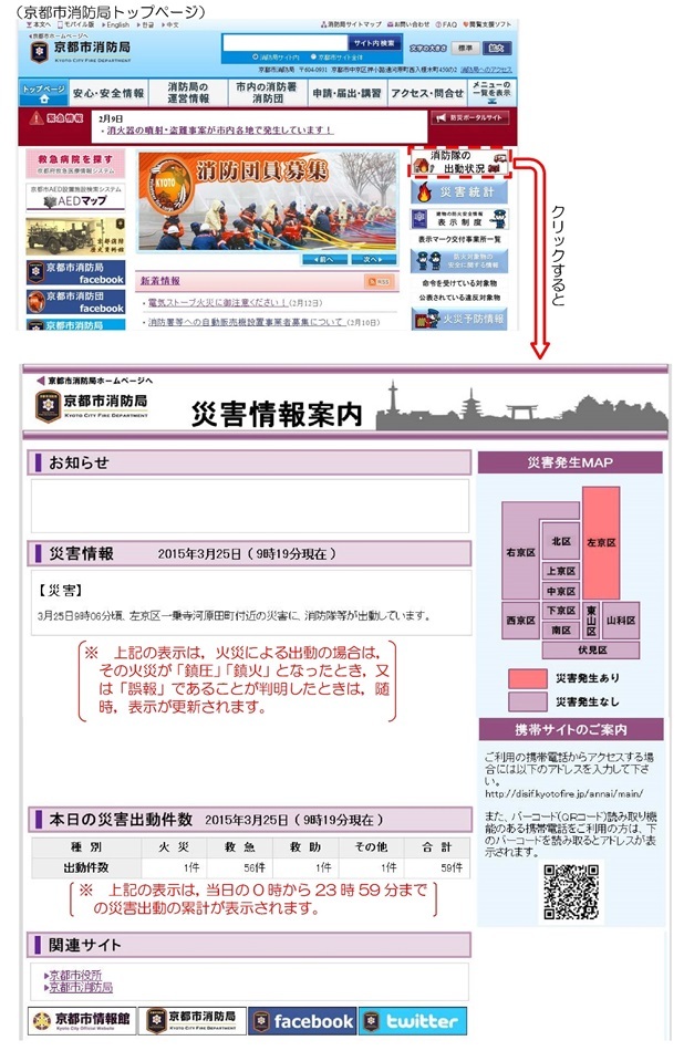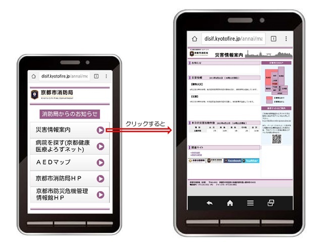 京都市内において,消防隊や救助隊等が出動する事案(救急事故は含みません。)が発生した場合に,スマートフォンやフィーチャーフォン,パソコンにより,災害情報をリアルタイムに確認することができます。
