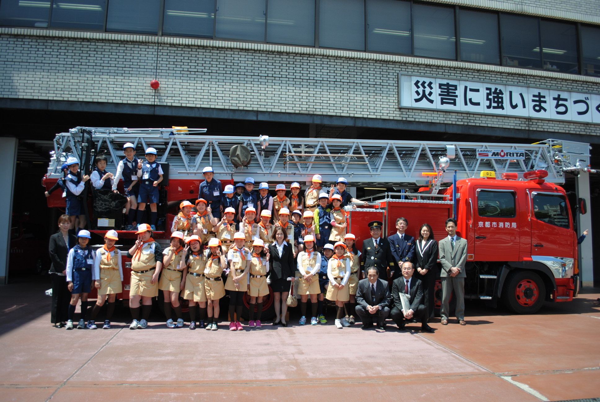 大型はしご車の前で,明るい雰囲気の集合写真です。