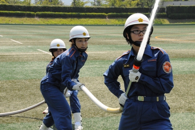 第一部では,西川左京消防団長の開会挨拶の後,女性消防隊による展示訓練が披露され,暑さを吹き飛ばすようなスピード感あふれる圧巻の訓練に,会場から大きな拍手が送られました。