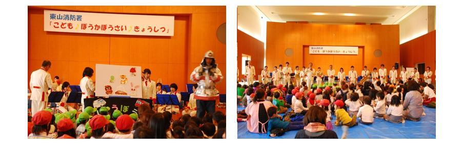 「こども ぼうかぼうさい きょうしつ」は、東山区内の保育園、保育所、幼稚園児及び未就学児童とその保護者を対象にした催しで、消防音楽隊による防火・防災コンサートを交えて、楽しみながら火事や地震が発生した時の対応などについて学んでもらいました。