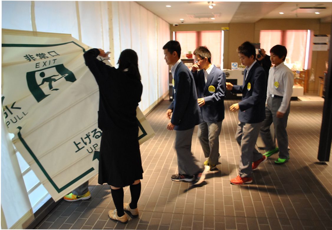 来客者としてチャレンジ体験中の中学生が参加し,避難を行ないました。