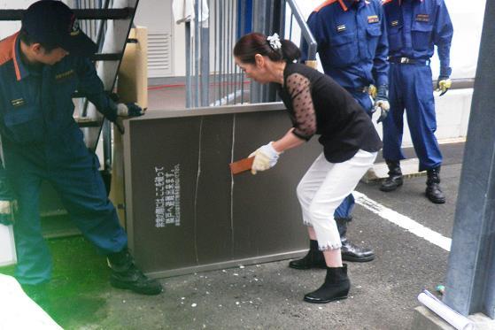 マンションのベランダに設置してある避難用の仕切り板を実際に破壊する体験をしていただきました。手や足を使って破壊するとケガをする恐れがあるので,ベランダにある物を使って破壊を試みました。なかでも物干し竿は1回の突きで仕切り板にヒビが入り2,3回続けて突くと破壊できることが分かりました。「もっと簡単に破れるものだと思っていた」「実際に破壊を体験できてよかった」「必要な時は破れる自信がついた」など様々な感想が聞かれました。