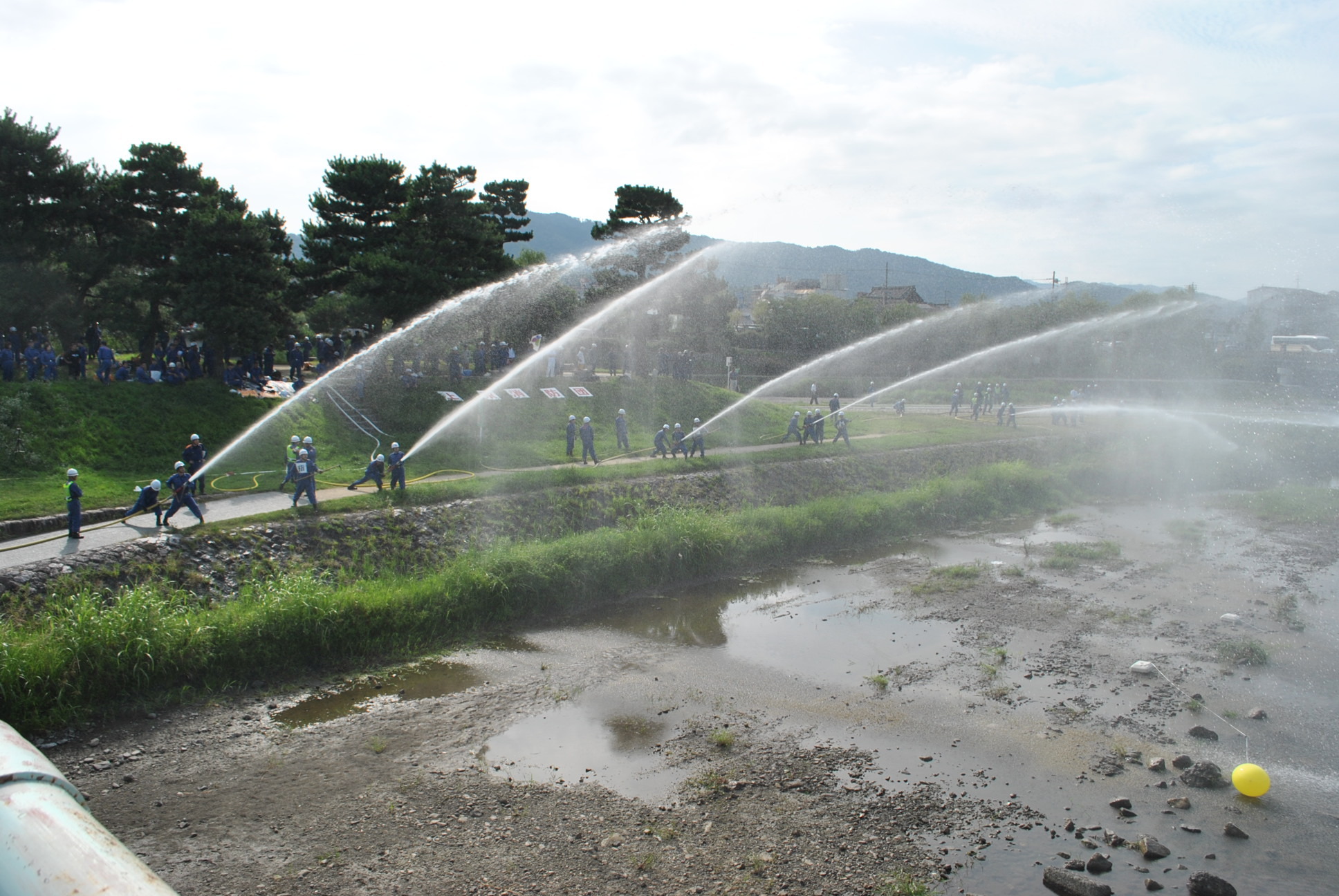 全17分団が4班に分かれ, 伊藤団長の指揮の下,各班ごとに分団が連携し,鴨川の水を4台の小型動力ポンプで吸水して,ホースを延長した後,標的に向けて8口で同時放水を実施しました。