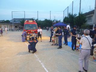 夏祭りが盛況になってきたところで,成逸消防分団の西脇分団長が登壇され,消防団員の募集を呼び掛けました。その終盤,大宮消防隊が会場に現れ,祭りに参加していた子供たちが,防火衣を着て消防車と一緒に写真撮影をしていました。