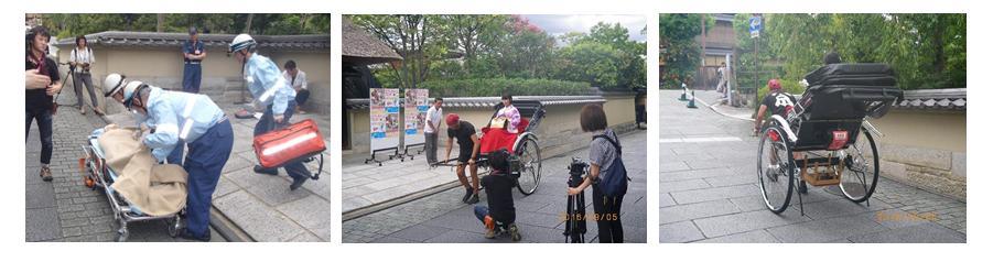 東山消防署では、5日、東山区の高台寺公園西側の「ねねの道」において、AEDを積載した人力車と合同で救命デモンストレーション訓練を実施しました。この訓練は、全国初となるAEDを積載した人力車の運用開始に伴い実施したもので、AEDを積載した人力車が、観光客1名を乗せ高台寺付近を走行中、路上に倒れている男性観光客を発見し、俥夫、乗客及び通行人(東山署員)が連携して救命活動(通報、心肺蘇生法及びAEDの活用)を実施し、救急隊に引継ぐという内容でした。訓練終了後、出発式が行われ、観光客や訓練見学者からの拍手の中、AED積載の人力車の運用が開始されました。人力車の運営会社、株式会社ベリープロジェクトの「えびす屋東山」では、既に約9割の俥夫が普通救命講習を受講し観光客や住民の急病に備えており、今回のAEDの積載は、心肺停止の傷病者に遭遇した場合、早期に救命活動にあたれるものと期待されています。
