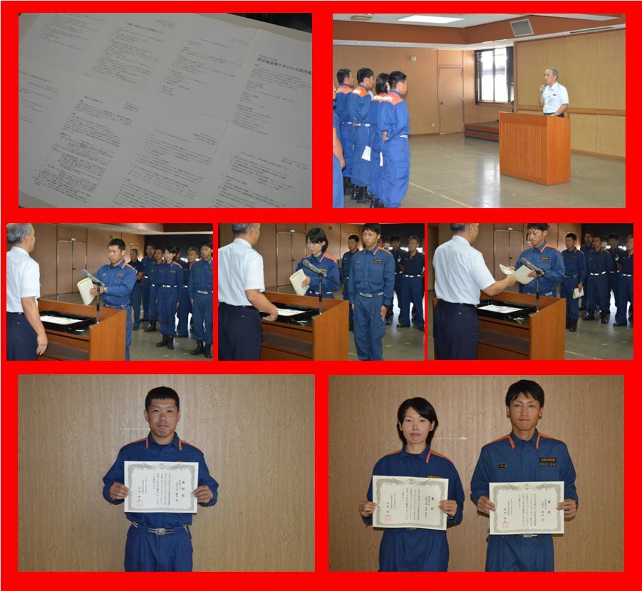「ワンペーパープロジェクト」では職員が決められた題材について,自分の思いや考えを分かりやすくワンペーパーにまとめる取組を実施しています。先日は「あなたが考える,市民対象の出火防止対策!」とのタイトルで,67名を対象に実施し,優秀作品作成者1名,優良作品作成者2名を選出し,署長表彰を実施しました。