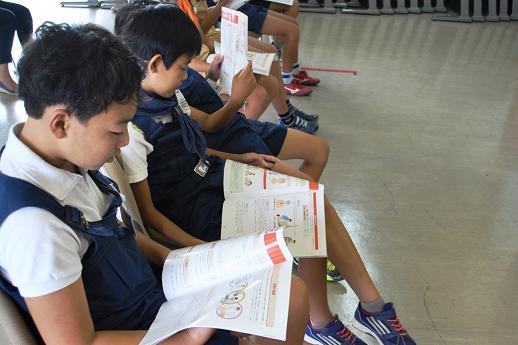 全員が,講師の救急係長から応急手当の必要性について学んだ後,6年生のクラブ員と2名の育成委員が普通救命講習を受講しました。