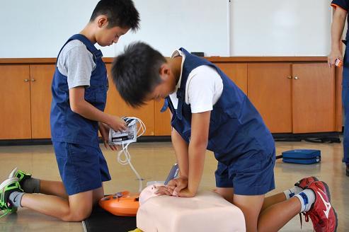 6年生以外のクラブ員は,トレーニング用の人形を使って心肺蘇生法とAEDの取扱いを体験し,確実な胸骨圧迫を途切れることなく続けることが大切なことを学びました。