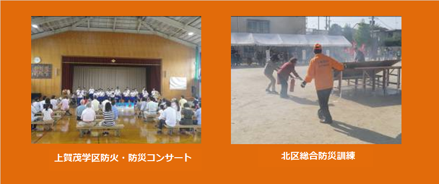 本年9月には,自主防災会等が中心となって「上賀茂学区防火・防災コンサート」を開催しました。このコンサートは,学区民に防火・防災に関心を持ってもらい,火災を減らすために,上賀茂小学校に消防音楽隊を招き実施したものです。当日は,多くの方が参加され,学区民の防火・防災力の向上につながりました。