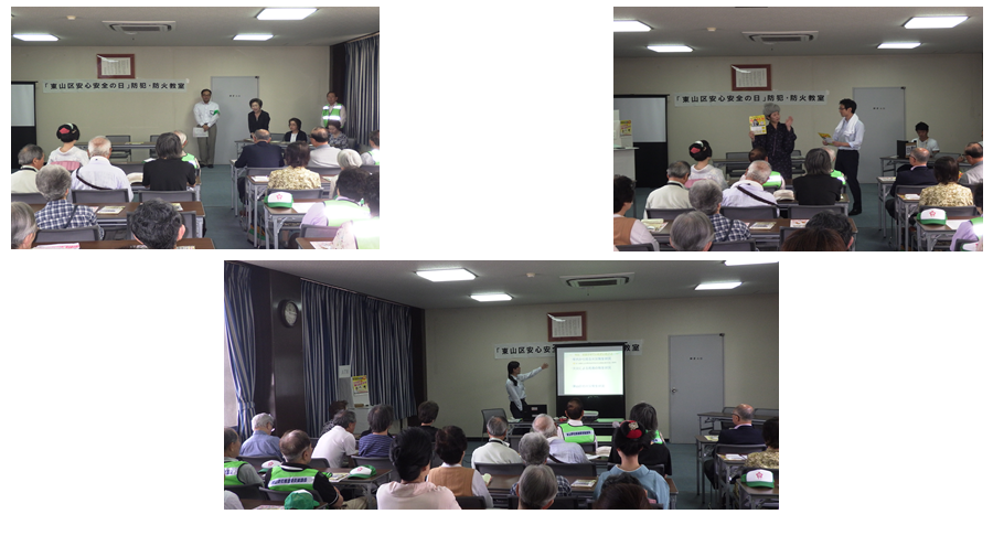 6月の「安心安全の日」は、宮川町お茶屋組合、新道学区自治連合会に協力いただき、宮川町歌舞練場会議室において、東山消防署、東山警察署、東山区役所による防犯・防火教室を開催しました。