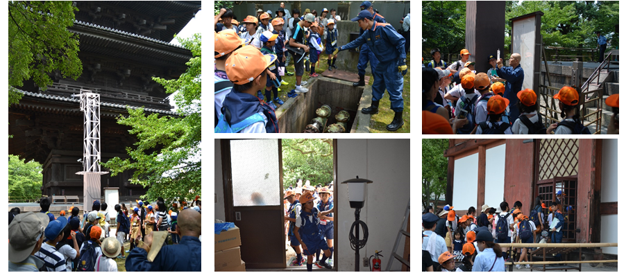 また,訓練には,南少年消防クラブの3名が消火隊員として参加し,放水銃で国宝の金堂へ放水しました。最後は消防隊と共に整列し,敬礼,参加者から大きな拍手をいただきました。