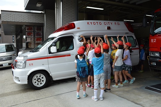 また,訓練を実施していた左京救急隊の車両を見学したり,心肺蘇生法を教えてもらいました。最後に屈折はしご車のはしごが伸びるのを見学し,その高さにビックリしていました。 皆さん,また来てくださいね!!