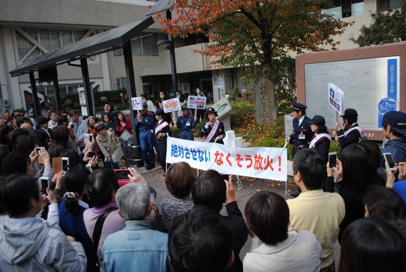 京都橘大学のキャンパスを皮切りに山科区内各所を移動しながら放火火災防止を呼び掛ける防火安全キャラバンに