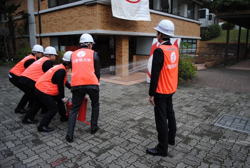 京都橘大学で,リバティーホールを複合施設(仮称「ショッピングセンター」)に見立てて消防訓練を実施しました。