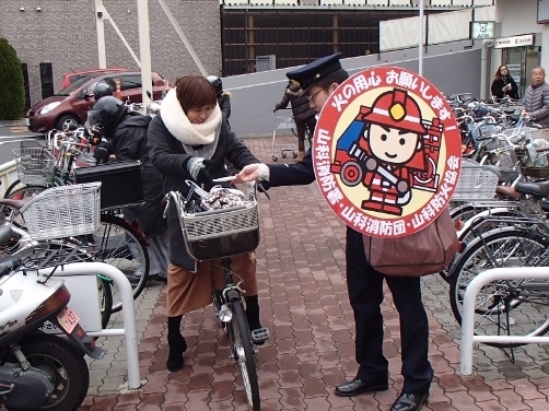 山科消防署では,年末防火運動(12月20日~31日)の一環として,区内の地下鉄やスーパーマーケット等の多くの区民の皆さんが出入りする場所を巡る防火キャラバンを行いました。