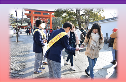 今回のチャレンジ体験では,文化財防火運動期間中とあって,伏見稲荷大社においての防火啓発を兼ねた街頭広報活動を実施していただきました。