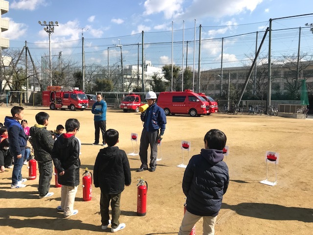 初めに,「地震が発生し,その後,校内で火災も発生した」との想定で,全員で避難訓練を実施しました。地震発生の校内放送が流れると子供たちは机の下で身を守る初動措置を行い,その後,担任の先生の指示に従って,グラウンドに避難しました。クラス担任以外の先生方には,119番通報や消火器を使用しての初期消火,避難誘導などを行ってもらいました。