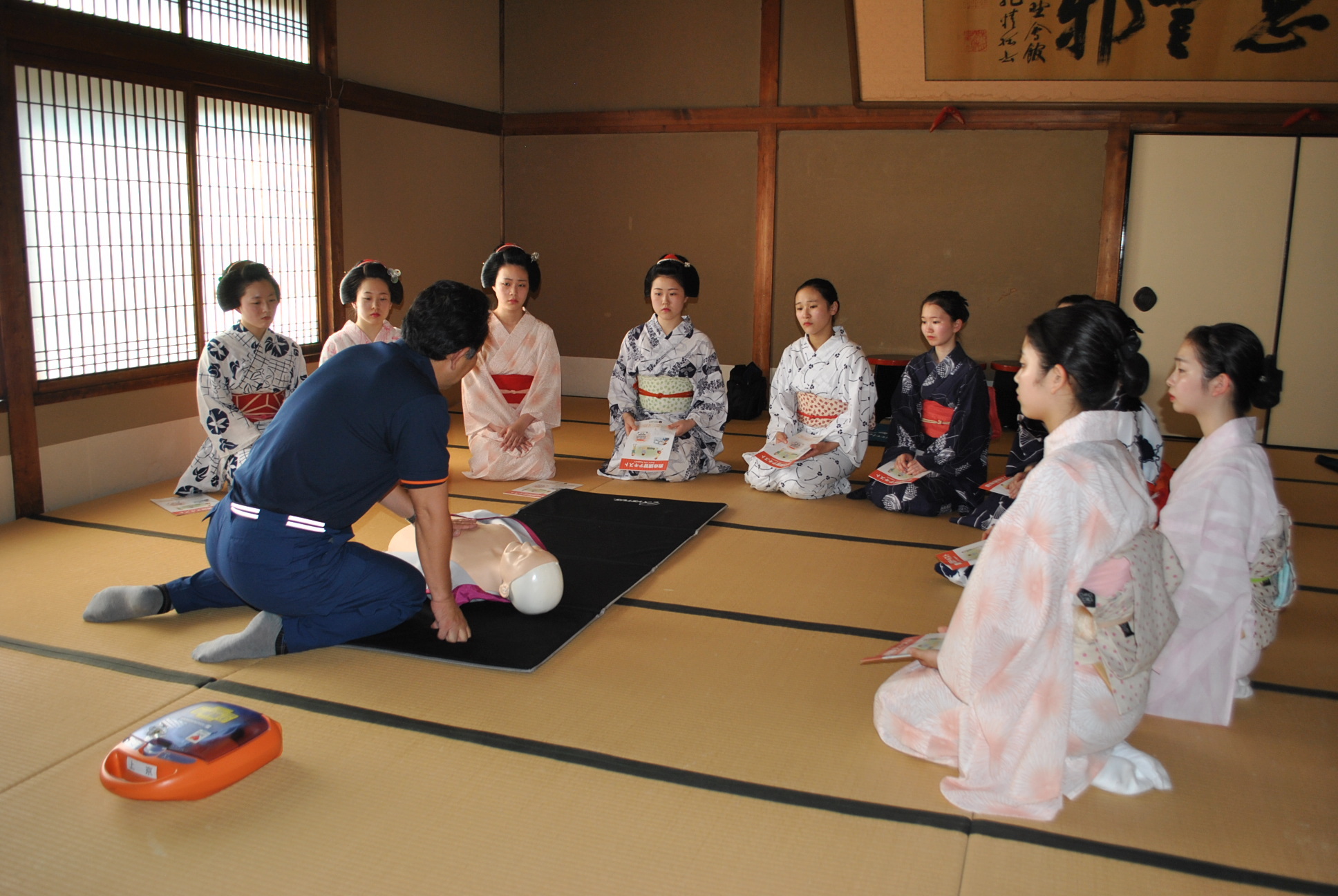 訓練後に,改めて,舞妓さんを対象に消火器及び屋内消火栓設備,AEDの取扱いについての講習を行いました。