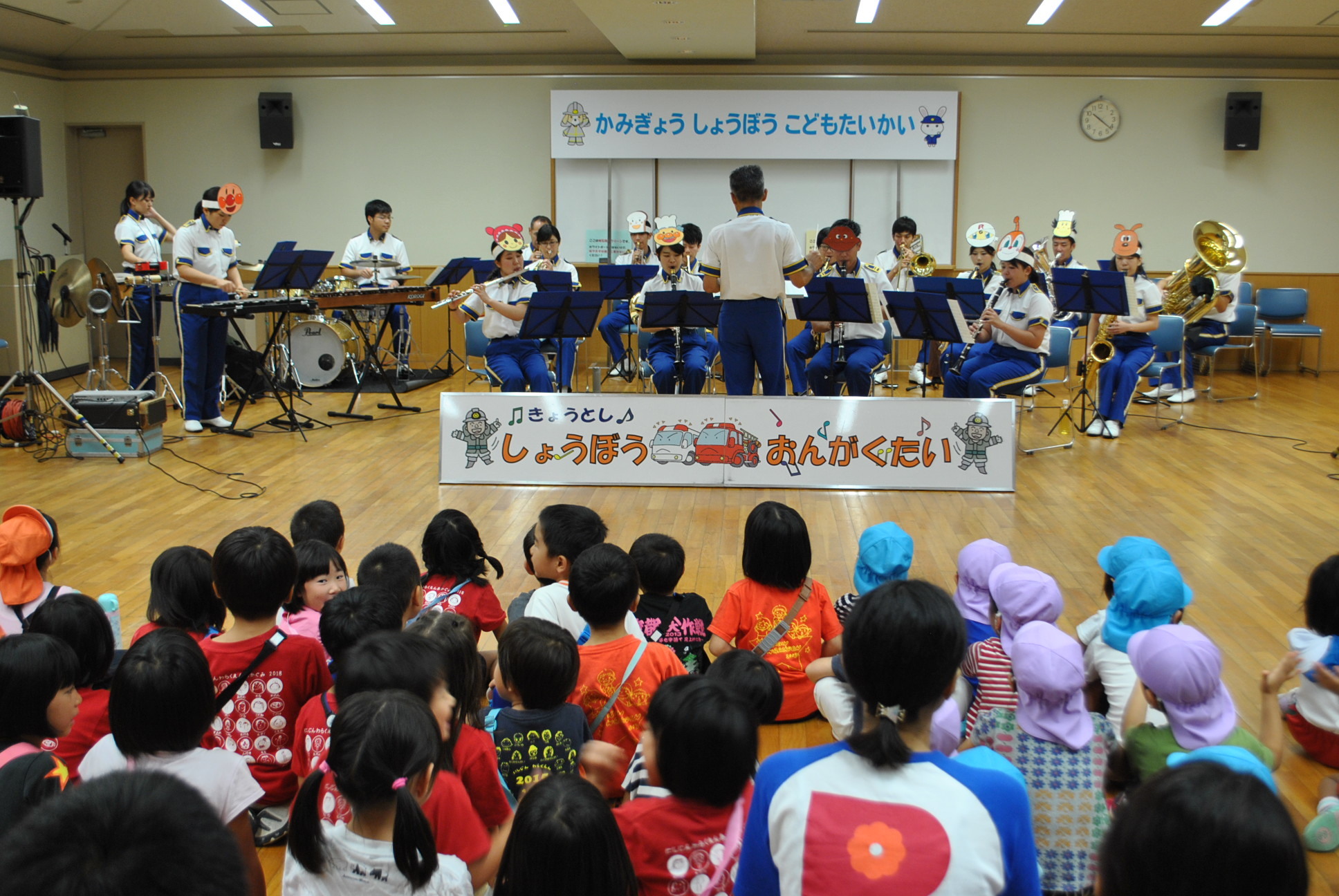 上京消防署では,この募集に合わせ,9月6日(木曜日)・7日(金曜日)に「平成30年度上京消防子ども大会」を開催し,区内の幼稚園や保育園の子どもたち(合計17園,775名が参加)を対象に,消防音楽隊による演奏やキャラクターショー「ほのおちゃん」,皆が大好きな消防車や救急車,大型はしご車の伸てい訓練の見学を行いました。