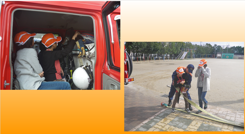 入会式の後に,神川消防隊の消防車内の見学と消防資器材をさっそく使っていました!素晴らしい(*^_^*)