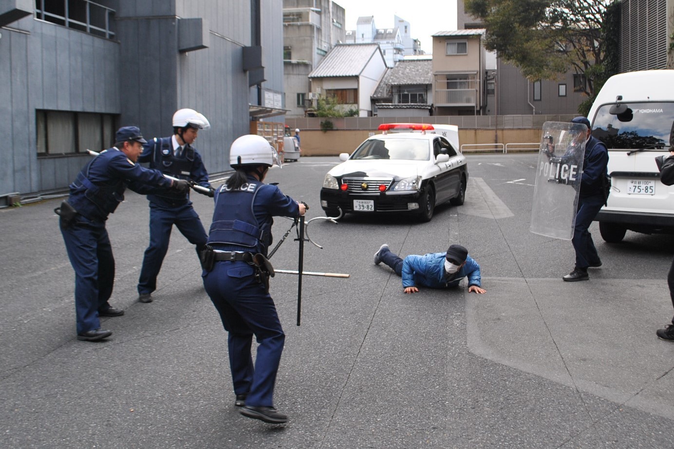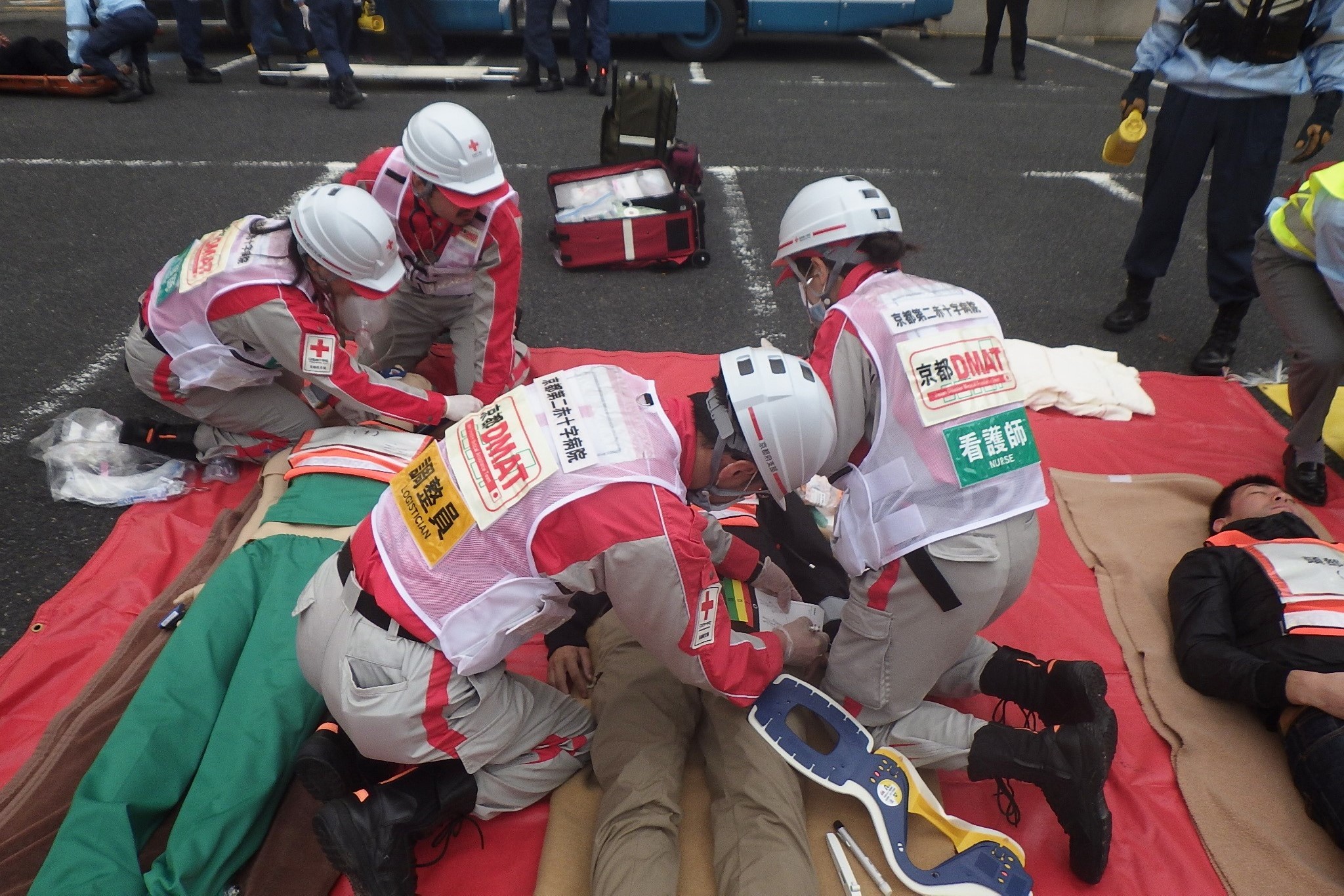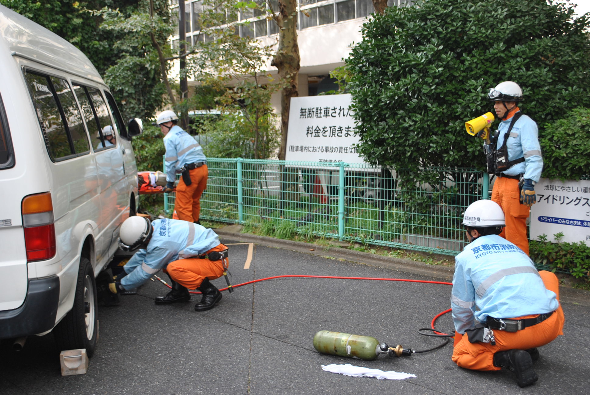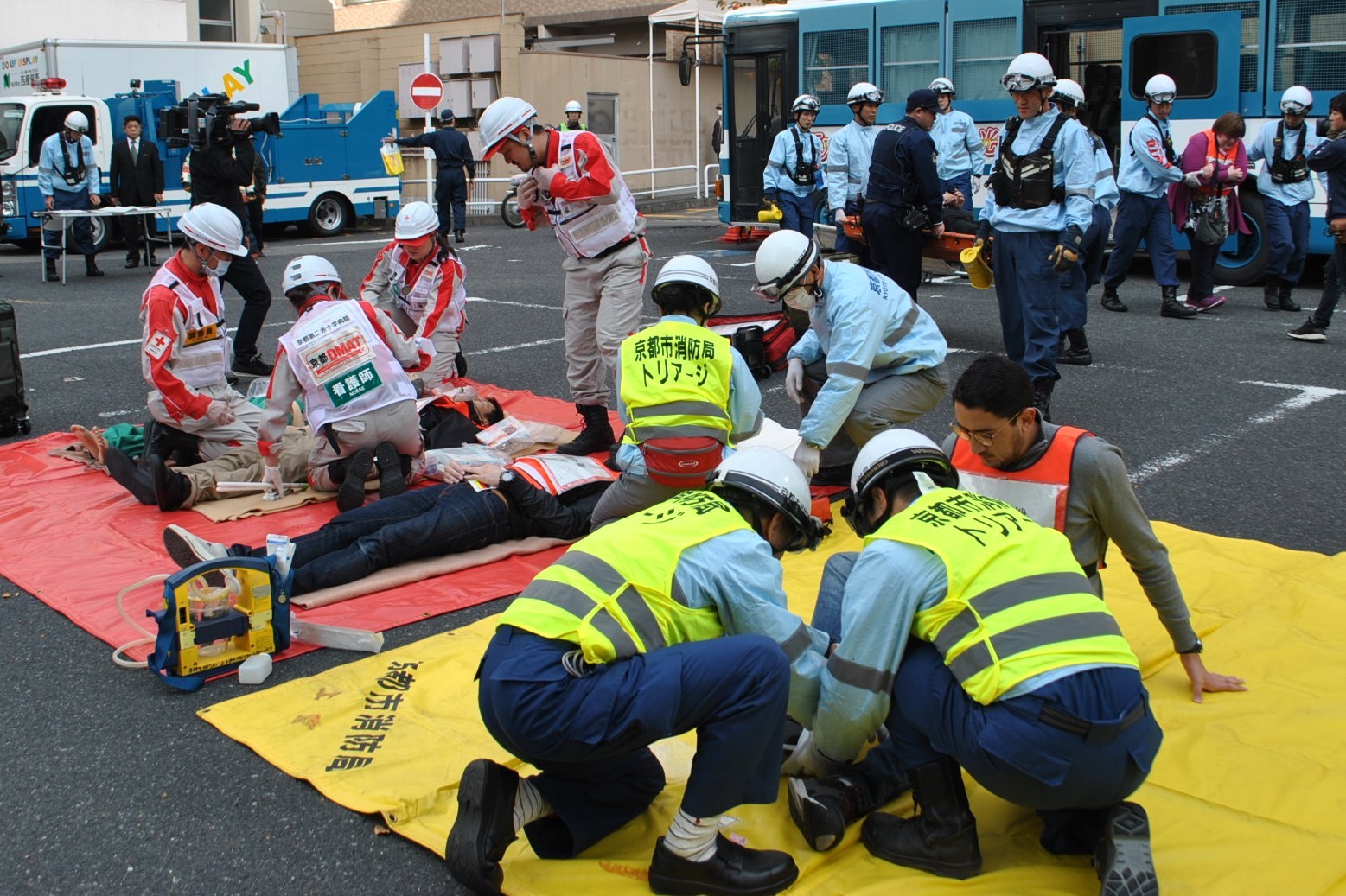 訓練は,区内にある西陣織会館の駐車場において,観光バスから降車した観光客の一行に暴走車両が突入し,多数の者が負傷する「無差別テロ」が発生したとの想定で,警察機関による犯人の制圧が行われた後,暴走車両の下敷きとなった要救助者の救出活動を救助隊が,跳ね飛ばされた負傷者の救護活動を医療機関と連携して消防隊及び救急隊が行いました。最後に,暴走車両内の爆発物処理活動を警察機動隊が実施しました。