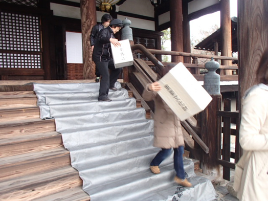続いて,「境内本堂から出火し,燃焼拡大中。」との想定で,妙顕寺職員が119番通報や火災の発生を地域住民に知らせるため,梵鐘をたたくなどの活動を行いました。梵鐘を聞いて集まった住民及び室町分団員が初期消火や重要物品の搬出を実施しました。
