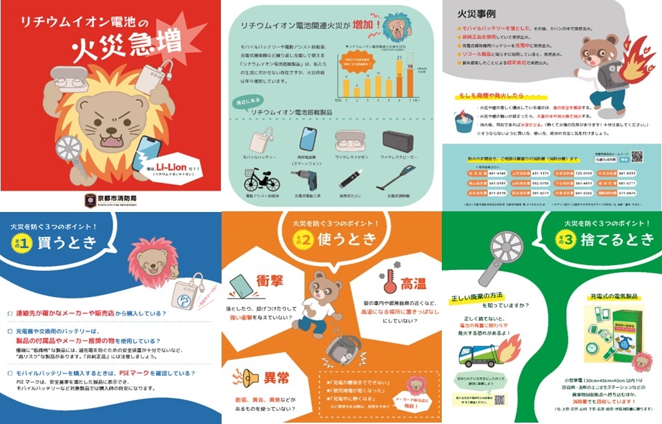 京都市消防局では、リチウムイオン電池を搭載した製品を取り扱う際の注意点をまとめたリーフレットを作成しました。