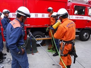 研修後半では、東山消防署屋上でレスキューフレーム(アリゾナボーテックス)を活用し、救助隊と救出方法等についての意志疎通を図りながら、現場をイメージした連携訓練を実施し、消防隊が実際のロープレスキューを使用する現場で、どのような活動をすれば良いかを1つずつ確認しました。
