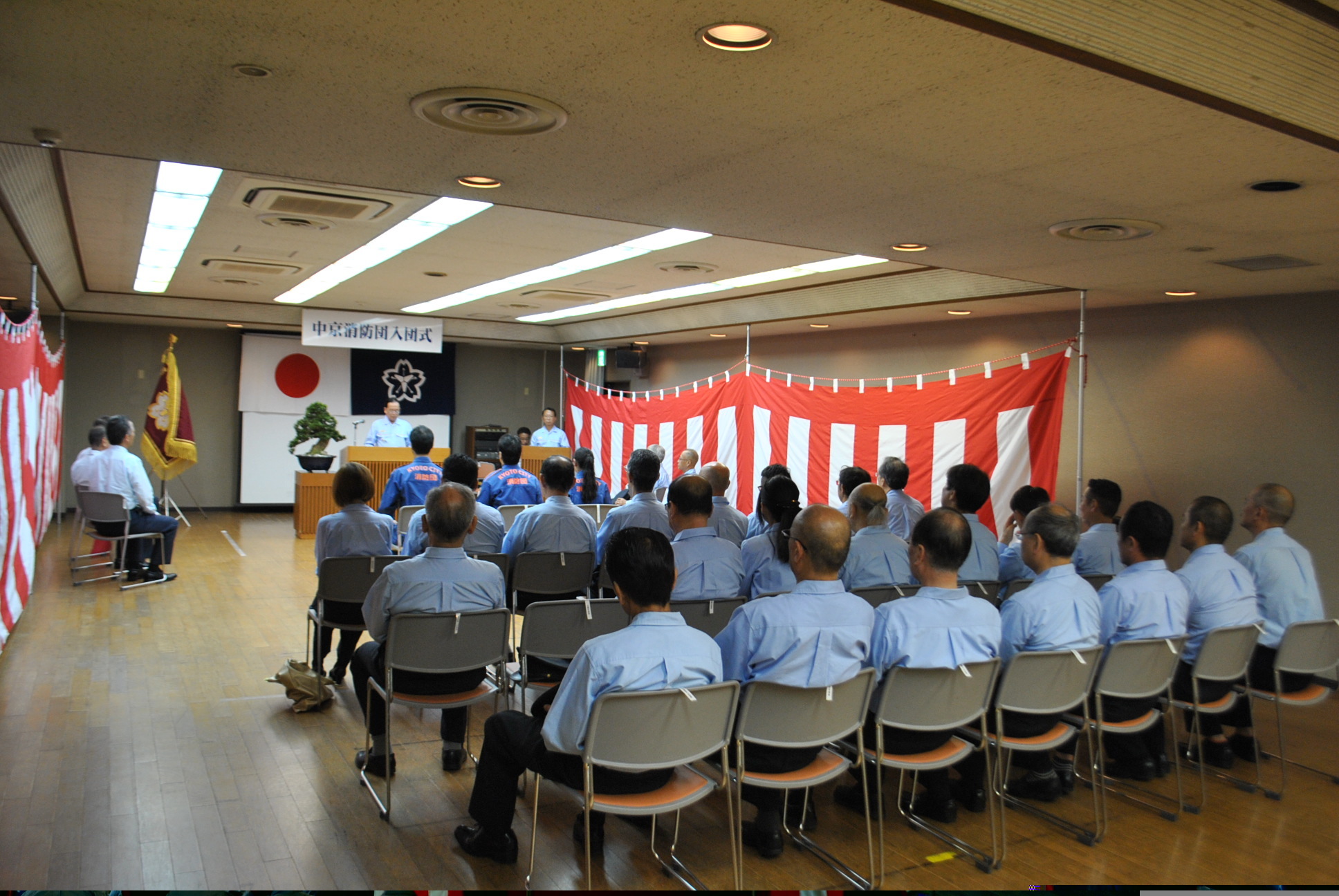 中京消防団長から「中京消防団へようこそ。大規模な地震や水災害が発生した場合,皆さんの力が必ず必要となります。中京区民の防火・防災の担い手として頑張ってください。」と激励され,新入団員の顔も一層引き締まっていました。