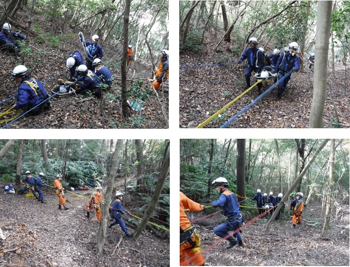 豊國廟山林内で入山者が滑落等により、自力歩行不能になったという想定で、斜面引揚救出及び斜めブリッジ救出等の訓練を行い、日頃の設定確認や訓練実施時における安全確認の重要性、現地特有の環境による救助ロープの設定の難しさを痛感し、現場さながらの有意義な訓練となりました。