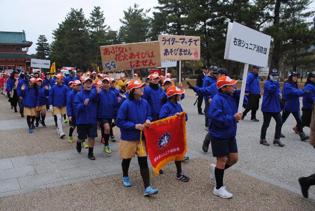 当日は天候が心配されていましたが,式典中は雨が降ることもなく,子供たちは笑顔で元気よく行進し,右京ジュニア消防団をしっかりとアピールすることができました。