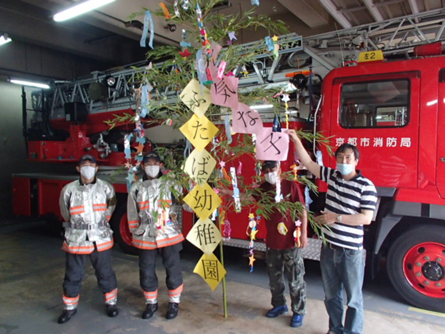 左京消防署(署長 奥田 浩喜)では,令和2年6月30日(火曜日)にふたば幼稚園のみなさんに飾り付けをしていただいた七夕笹をいただきました。残念ながら,新型コロナウイルス感染症感染拡大防止のため,園児の皆さんには来ていただくことができませんでしたが,代わりに幼稚園職員の方々から,消防隊員に贈呈していただきました。