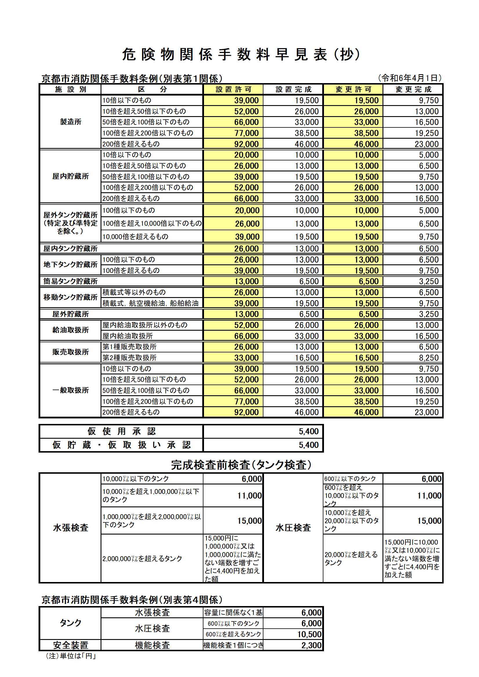 京都市火災予防条例別表第4を早見表にし、危険物関係の申請手数料を分かりやすく表示しました。(第61条 手数料)