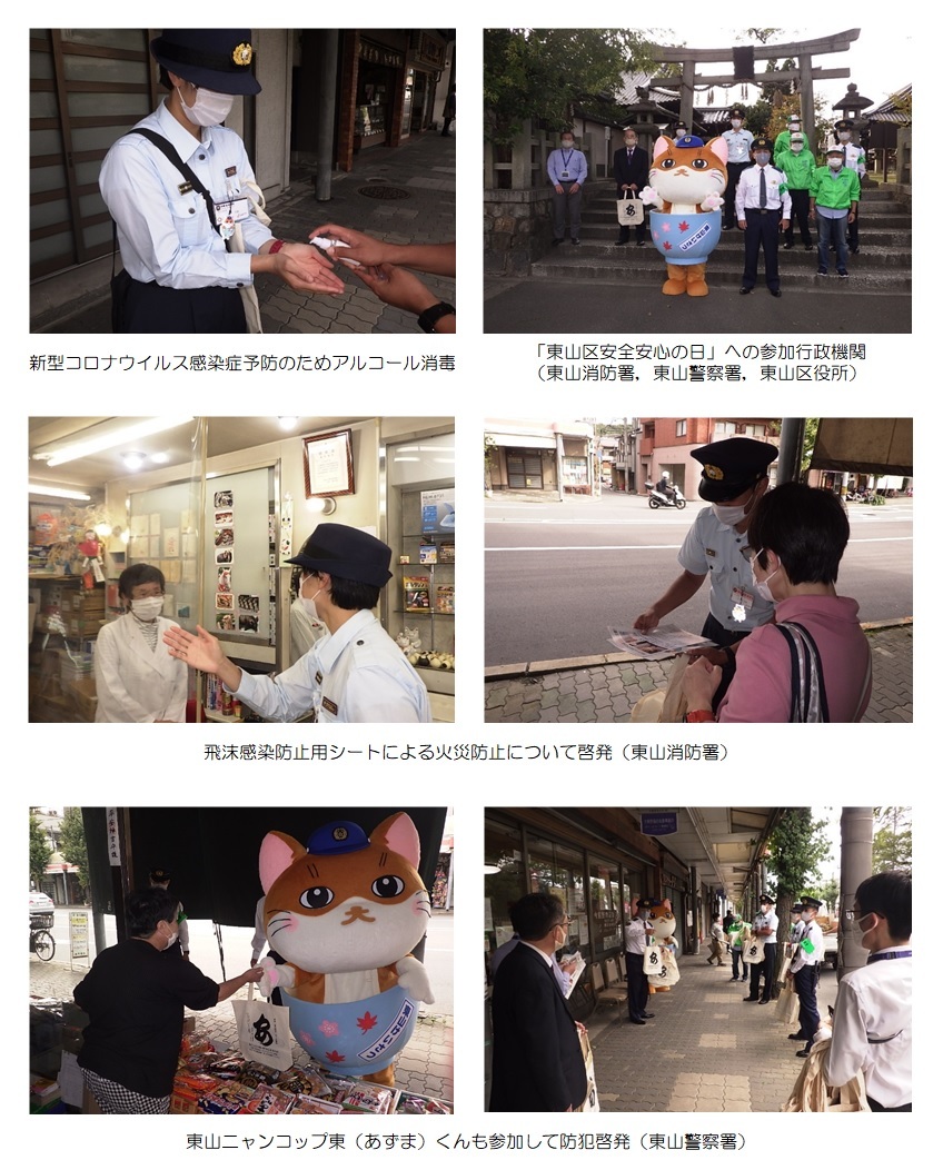 東山消防署からは、飛沫感染防止用シートやアルコール消毒液による火災予防の啓発を行い、東山警察署からは防犯マスコットの「東山ニャンコップ 東(あずま)くん」が参加し、防犯の啓発を行いました。