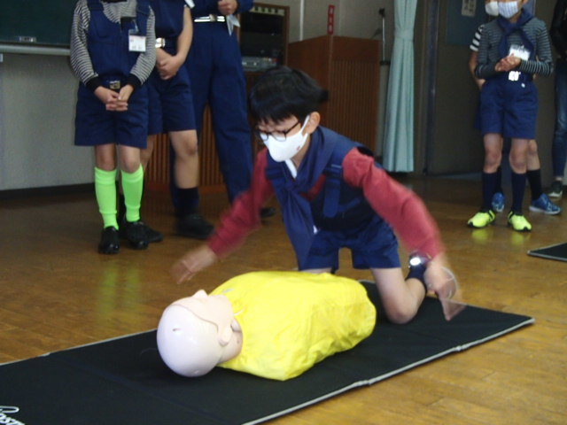 訓練人形や訓練用AED等を使って応急手当を体験し,胸骨圧迫では,正しく圧迫することの難しさや予想以上の疲労により,命を救うことの大変さを実感しました。ジュニア消防団員たちは,消防署員の指導に真剣に耳を傾け,実技にも積極的に取り組んでいました。