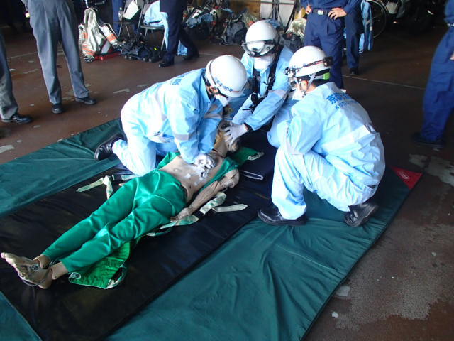 現場に到着すると隊長の指示の下,関係者から情報を収集しながら適切な救命処置を実施します。