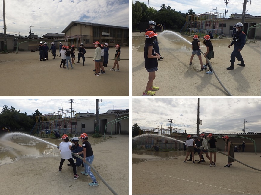 令和2年9月20日 住吉小学校で実施された住吉分団の小型動力ポンプ取扱訓練に併せて伏見ジュニア消防団住吉班が放水訓練を実施しました。