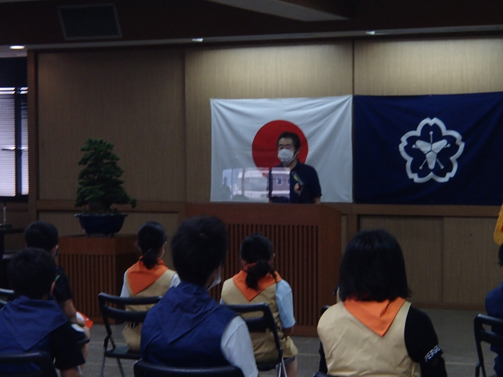 新入団員の子供たちはマスクを着用し,新型コロナウイルス対策を万全にして,「ちかいの言葉」を朗唱してくれました。