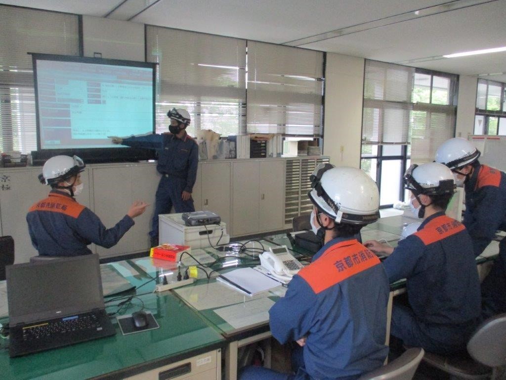 京都市消防局では,大規模な災害が発生した際,非番や休日の職員を消防署に招集し,各消防署に署警防本部を設置します。署警防本部では,多くの情報を的確に処理し,様々な災害に適切に対応するために,災害に対応する部隊のほか,部隊をバックアップする班や,情報を集約し整理する班等を編成します。今回は,署警防本部の設営の手順や運営の流れ,それぞれの班の役割などを再確認しました。