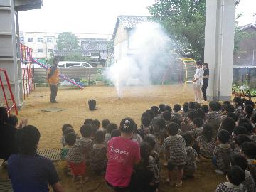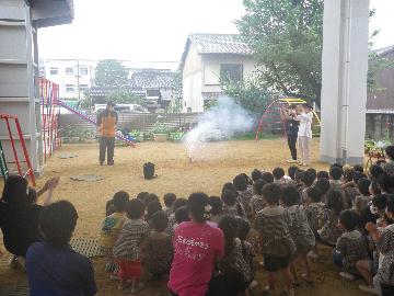 当日は、3歳から5歳までの園児たちが先生方と一緒に消防職員から、安全な花火遊びについて、学びました。先生によ
