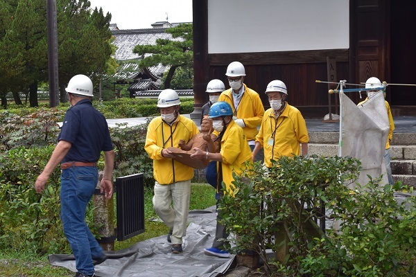 近隣住民で組織される建仁寺文化財市民レスキュー隊による模擬仏像の搬出
