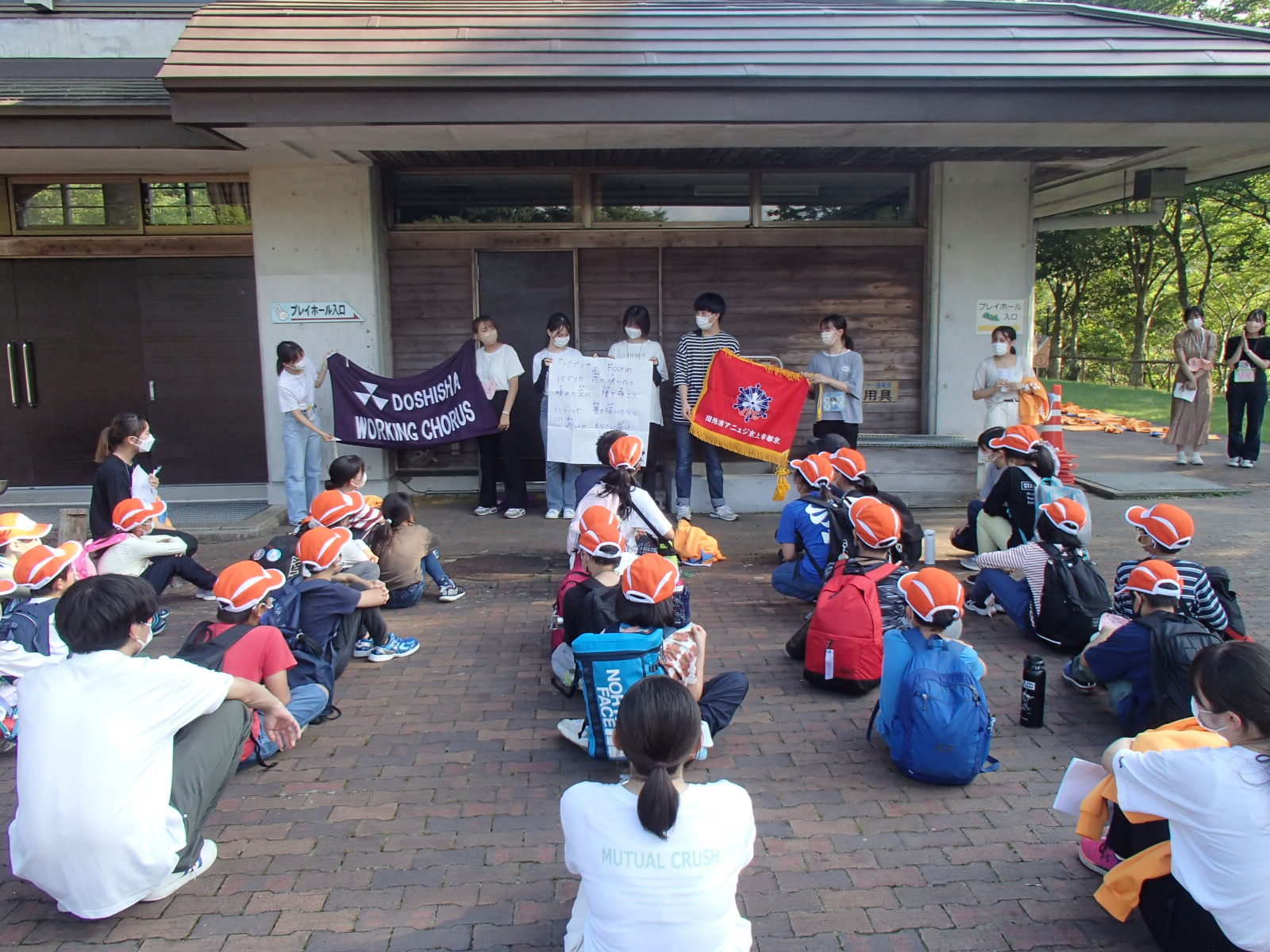今回の研修には、ジュニア消防団21名と指導員6名に加え、一緒に活動してくださる同志社大学ワーキングコーラスの学生の皆さんが参加し、親睦を深めました。