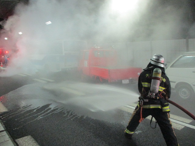 今回の訓練では、トンネル内という特殊な環境の中、衝突事故による負傷者の救出及び出火車両への放水活動を行い、関係機関との連携も強化することができました。
