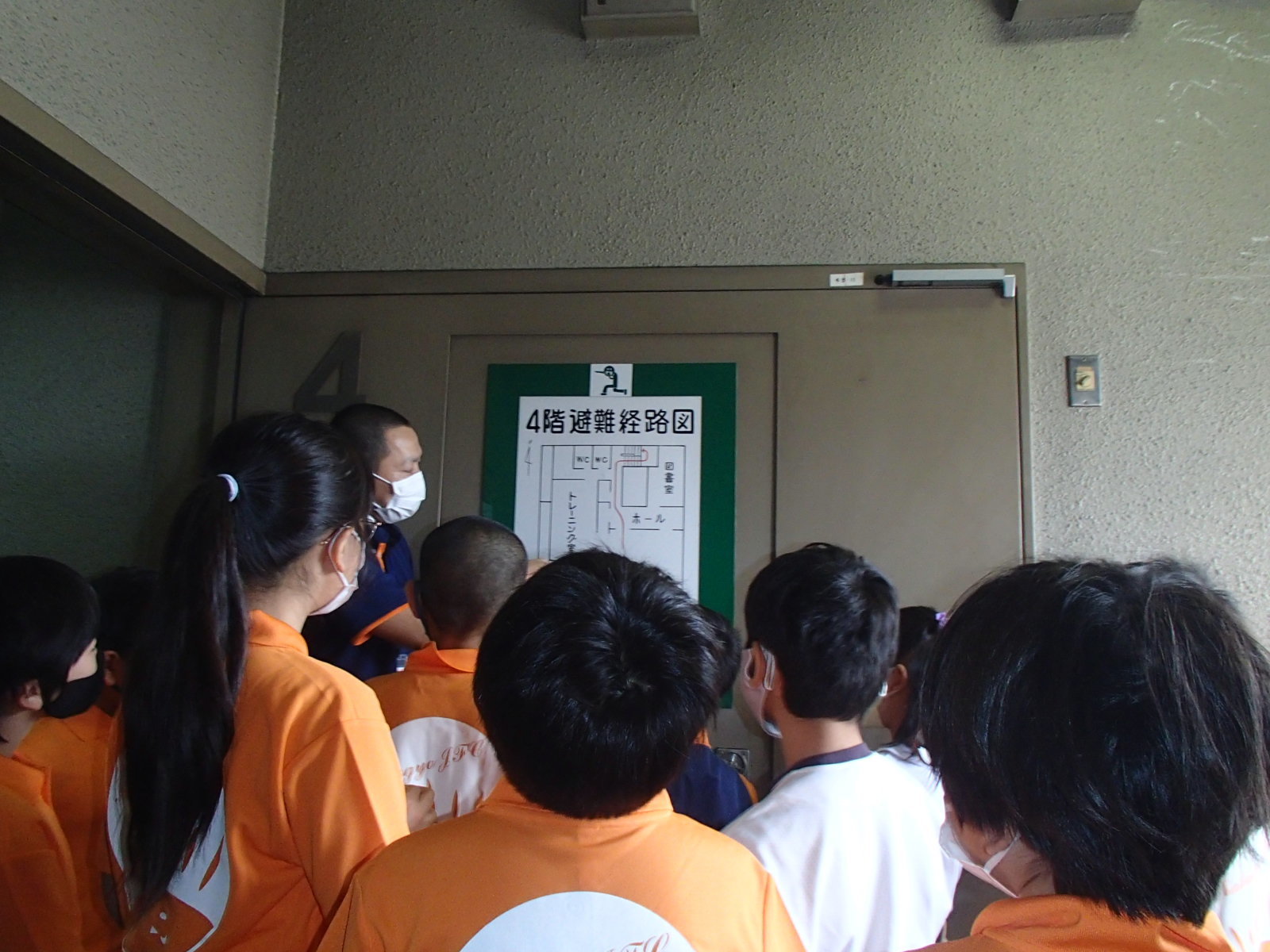 建物に設置されている消防用設備等がどのように作動するか、避難の際にどのように活用するかについて、学びました。