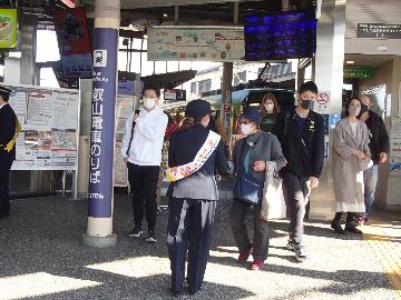 昨年度に実施した「きらら隊」による同駅周辺においての街頭広報では、コロナ禍で叡山電鉄を利用される方が少なかった印象でしたが、今年度は人が多く、左京消防署で用意したウエットティッシュは開始からわずか数十分で配布が完了しました。