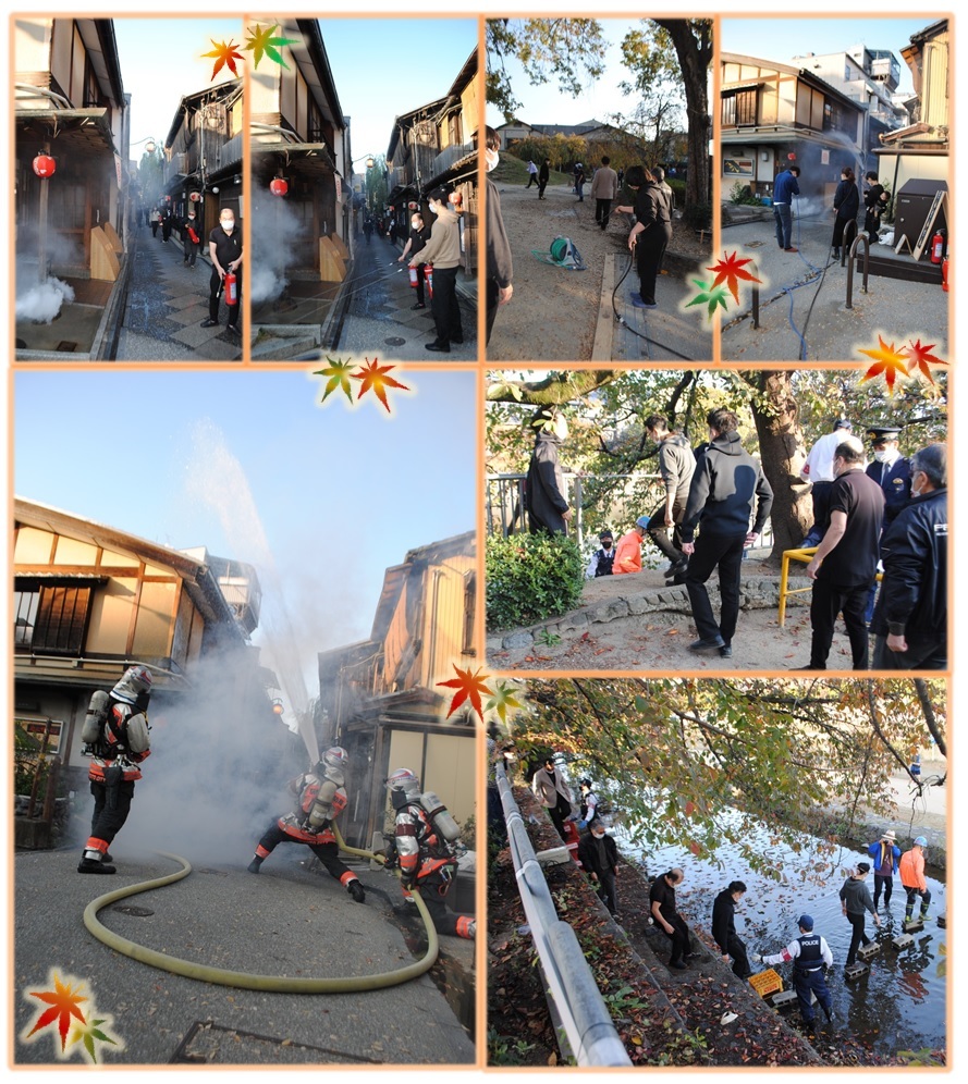 先斗町このまち守り隊による初期消火活動~公設消防隊による消火活動~先斗町公園から鴨川河川敷への避難