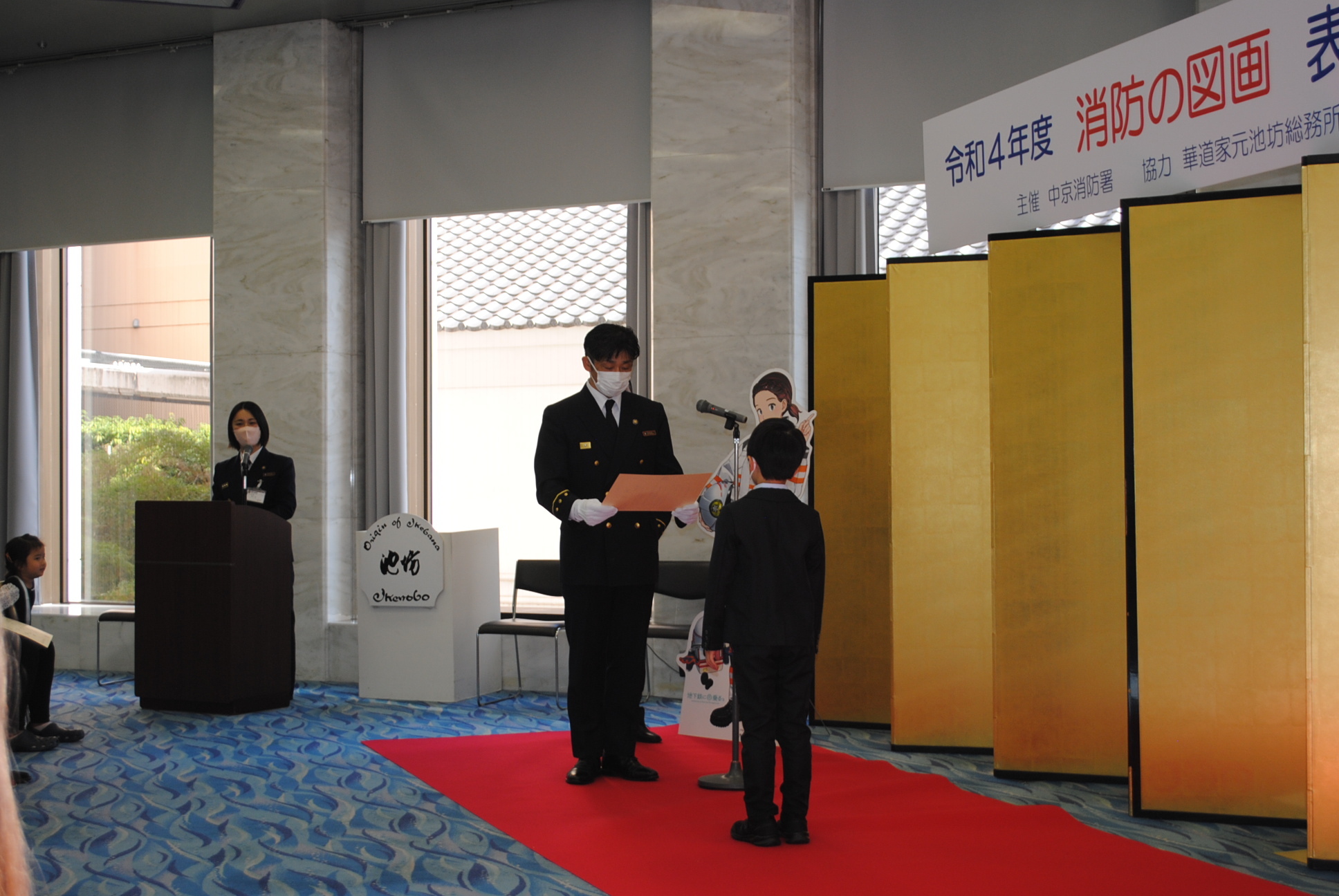 中京消防署では、12月10日(土曜日)に令和4年度中京消防署「消防の図画」表彰式を中京区の池坊会館大ホールにおいて開催しました。当日は、入賞者の皆さんや御家族等多くの方が来場され、にぎやかな式典となりました。入賞した児童の皆さんは、名前を呼ばれると元気よく「はい!」と返事をし、賞状とメダルを受け取りました。また、会場には、ハンド&ネイルケアボランティアチーム「ガンチー」によるネイルシールケアブースも設けられ、多くの方にネイルシールによる防火防災啓発を試していただきました。
