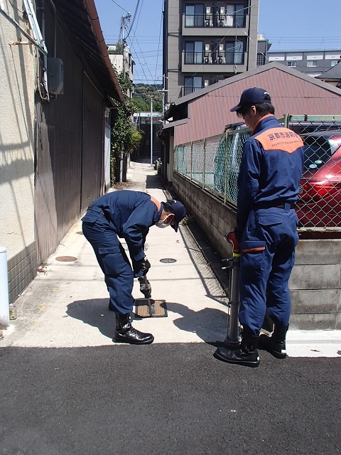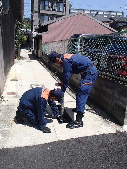 消火栓や防火水槽の蓋を開け、使用上の問題がないか、水量は満たされているか等内部の確認と、蓋の形状や標示等外部の確認を併せて行っています。